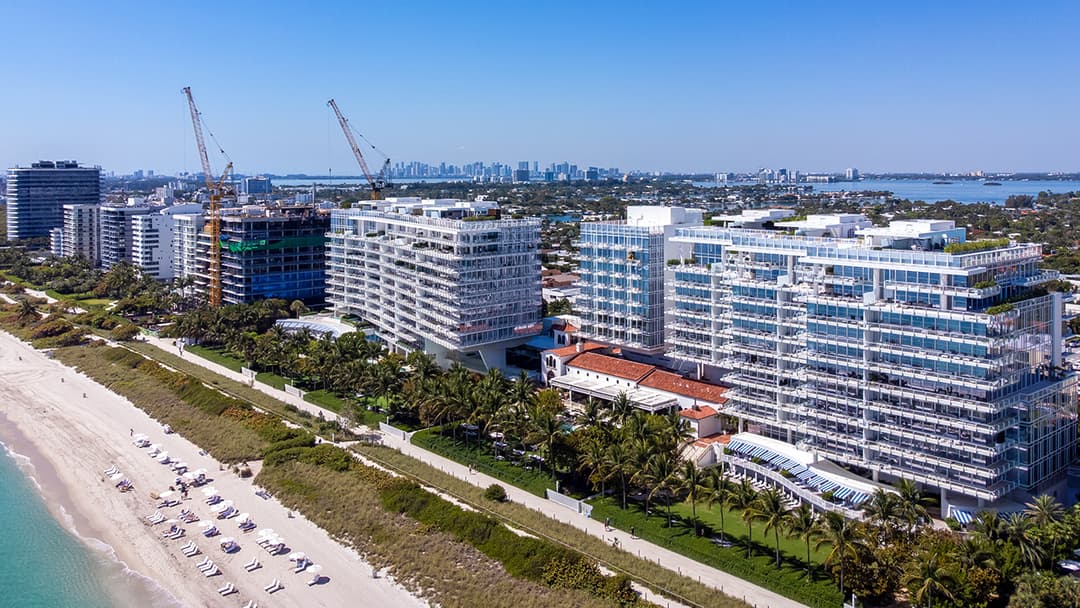 At the legendary Four Seasons Surf Club in Surfside, Florida, the modern coastal aesthetic is defined by striking architecture and a warm glow all around, illuminating custom millwork and slatted wood feature walls. Outside, rows of crisp white umbrellas line tranquil pool decks that reflect resort-style luxury.